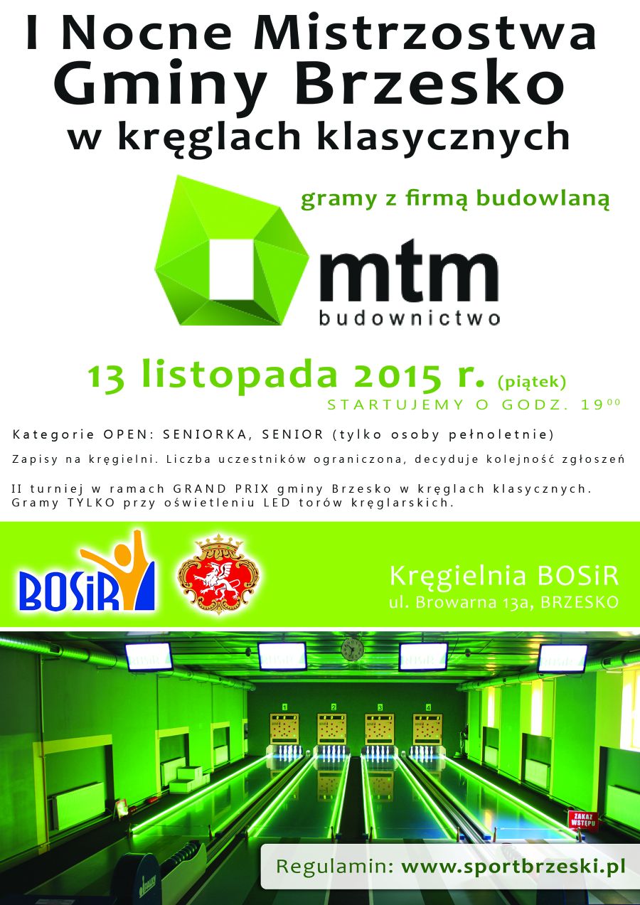 Wszystkich miłośników kręgli klasycznych serdecznie zapraszamy do udziału w I Nocnych Mistrzostwach Gminy Brzesko, które swoim patronatem objęła Spółka MTM Budownictwo. Zawody odbędą się 13 listopada 2015 (piątek). Start o godz. 19.00. Jest to II turniej w ramach cyklu GRAND PRIX.